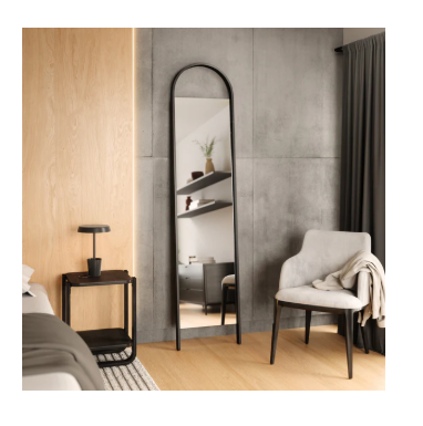 Un miroir arqué au cadre noir élégant, à poser au sol pour agrandir l’espace et ajouter une touche chic à votre déco.