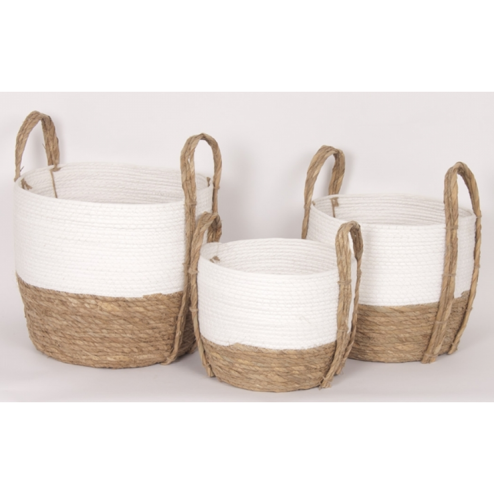 Conçus en jute naturelle et coton tressé blanc, ces paniers allient élégance minimaliste et praticité.